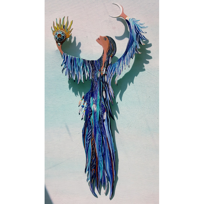 10"x10". Three-dimensional hand-painted on metal with wall hangers on the back. Fo..