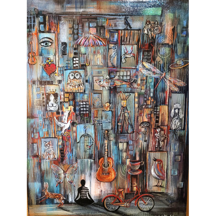 10"x10". Three-dimensional hand-painted on metal with wall hangers on the back. Fo..