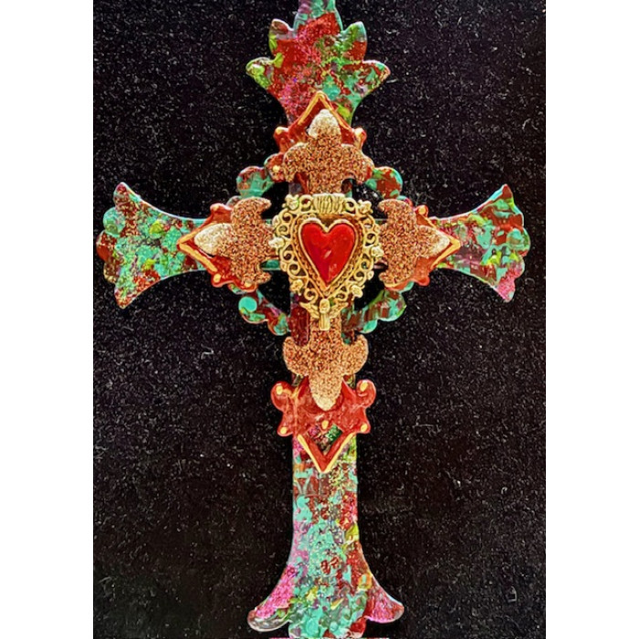 7”X 5” four layered cross. Hand painted metal, wall mount in back, signeD