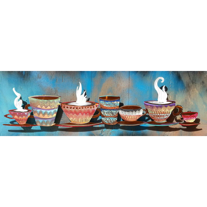 29" x 7.25".Seven Cups. Hand painted on metal with a copper finish. Wall hangers on back. Signed by the artist, Robert Shields.