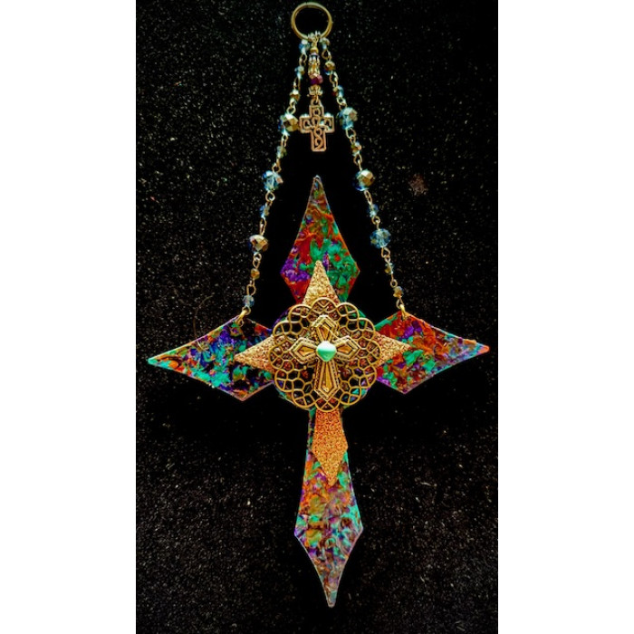 9"x2" with chain 14"x2". Hand-painted on metal with beaded chain and a copper-plated cros..