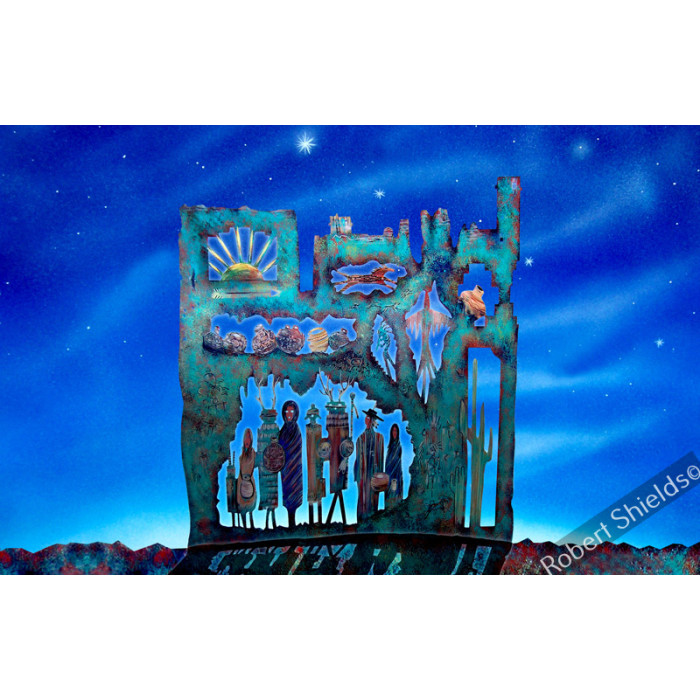 15"x10". Hand-painted on metal with wall hangers on back. Signed by the artist, Robert Shields...